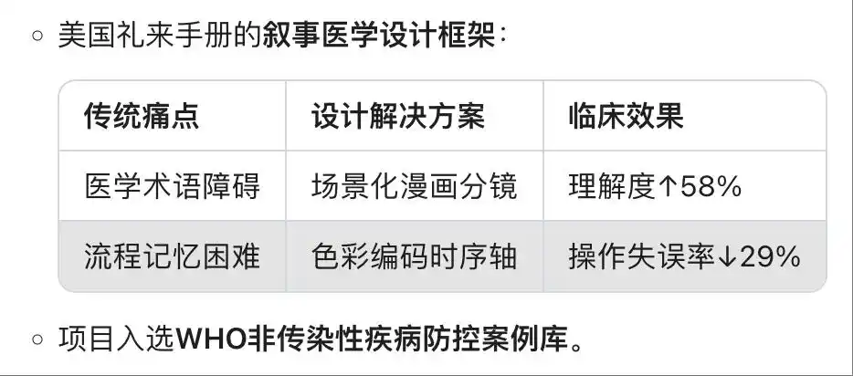 2022 糖尿病管理范式创新 美国礼来手册构建叙事医学设计框架:以场景化漫画分镜解决医学术语障碍(理解度↑58%),以色彩编码时序轴58%),以色彩编码时序轴优化流程记忆(操作失误率↓29%)。项目入选WHO非传染性疾病防控案例库,方法论应用于2022年冬奥会医疗急救视觉系统设计。